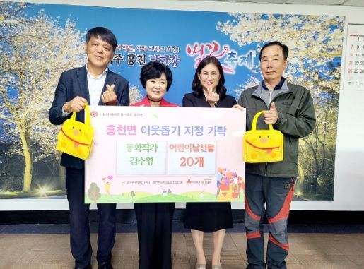 지난 5월 3일 흥천면 귀백리에 거주하는 김수영 동화작가가 직접 포장한 ‘어린이 선물’ 20개를 흥천면 행정복지센터에 기탁했다.