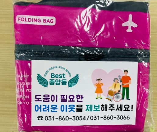 이번에 제작한 물품은 여가생활에서 유용하게 사용 가능한 여행용 가방으로, 특히 가방 포장 비닐 앞면에 복지 사각지대 제보 문구와 행정복지센터 전화번호 스티커를 부착하여 향후 복지 위기 의심가구에 배부하는 등 홍보 효과를 높여 나갈 예정이다.