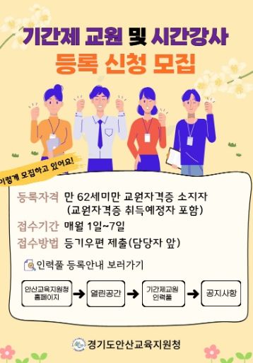 [제주교통복지신문 김강석 기자] 안산교육지원청은 매년 2회 상·하반기로 모집하던 기간제교사 인력풀을 매달 1일~7일 모집으로 확대하여 운영한다고 밝혔다.