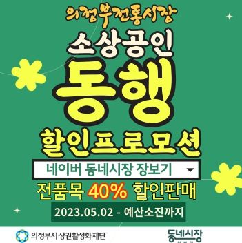 ‘소상공인 동행 할인프로모션’은 5월 2일부터 예산소진 시까지, 네이버 동네시장 장보기 의정부전통시장 플랫폼에서 진행되며, 입점된 모든 점포의 다양한 상품을 40% 할인 된 가격으로 구매할 수 있다. 동네시장 장보기는 매주 월~금요일(오전10시~오후 5시, 공휴일 제외) 운영되며, 의정부시 관내 어디든지 2시간 이내로 배달이 가능하다.