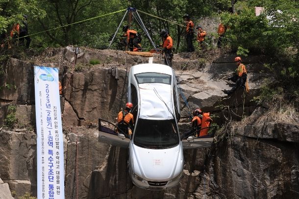 경기도북부특수대응단이 주관한 이번 훈련에는 6개 기관(경기도북부특수대응단, 경기도특수대응단, 중앙119구조본부 수도권특수구조대, 서울특수구조단, 인천특수대응단) 119구조대원 60여 명이 참가한 가운데 지진 발생으로 절벽에 추락 직전인 차량 내 구조대상자가 고립된 상황을 가정해 진행됐다.