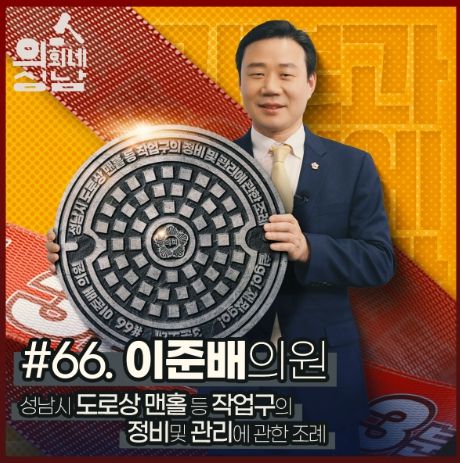 이번에 소개된 조례는 이준배 의원 등 13명이 발의한 ‘성남시 도로상 맨홀 등 작업구의 정비 및 관리에 관한 조례’이다. 이 조례는 시민이 안전하게 도로를 이용할 수 있도록 도로상에 설치된 작업구의 효율적인 관리 및 정비 체계에 필요한 사항을 규정하여 재해 및 재난 시 필요한 작업구에 대해 긴급정비공사를 할 수 있게 하여 시민의 안전상 우려를 개선하고자 제정됐다. 이 조례는 2022년 10월 31일부터 시행 중이다.