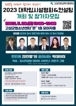[제주교통복지신문 김강석 기자] 고성진로교육지원센터가 5월 20일 고성군청소년센터“온”에서 2023년 대학 입시 설명회(컨설팅)를 개최한다.