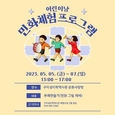 어린이날 민화그리기체험은 어린이날을 맞이해 5월 5일부터 5월 7일까지 3일간 구미성리학역사관 문화사랑방에서 어린이들이 선생님과 함께 민화그림 부채를 채색하는 체험프로그램이다. 예약없이 구미성리학역사관을 방문해 체험할 수 있으며, 당일 체험수량(100여개)이 소진될 경우 체험이 어려울 수 있다.