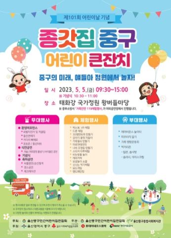 [제주교통복지신문 김강석 기자] 제101회 어린이날을 맞아 오는 5월 5일 9시 30분부터 울산 중구 동천체육관에서 ‘2023년 종갓집 중구 어린이 큰잔치’ 행사가 열린다.