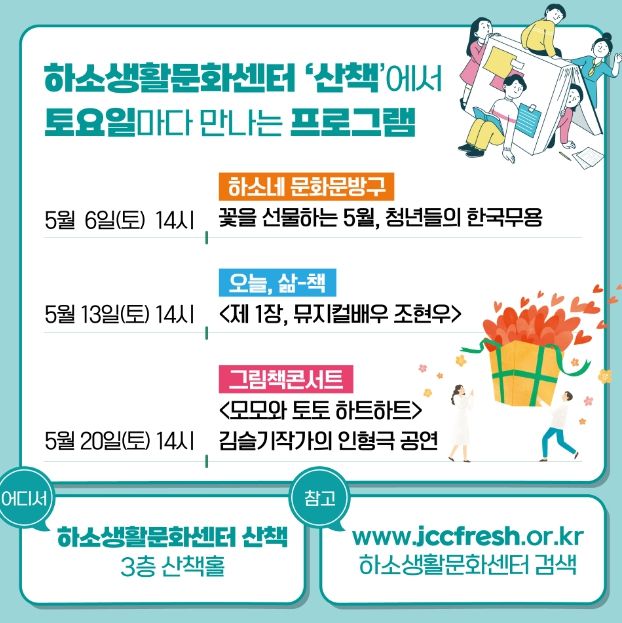 이 한 달 간 산책에서는 ▲6일 오후 2시 하소네 문화문방구‘꽃을 선물하는 5월, 청년들의 한국무용’을 시작으로, ▲13일 오후 2시 오늘, 삶-책‘제1장, 뮤지컬배우 조현우’, ▲20일 오후 2시 그림책콘서트, 김슬기작가의 인형극 공연‘모모와 토토 하트하트’등이 열린다.