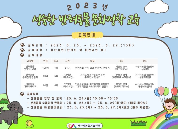 [제주교통복지신문 김강석 기자] 충남 서산시가 민선8기 반려동물복지 지원센터 운영의 일환으로 ‘2023년 성숙한 반려동물 문화정착 교육’을 진행한다고 밝혔다.