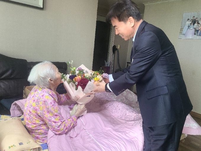 조일교 아산시 부시장은 지난 3일 온양1동에 거주하는 갈복순(여, 100세) 어르신 댁을 방문해 장수 축하 인사를 드리며 담소를 나눴다.