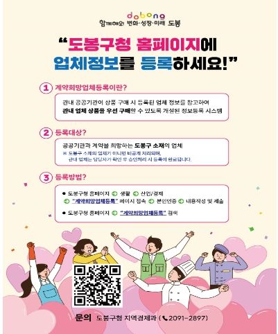 구는 도봉구 홈페이지에 구 직원 및 공공기관이 참고할 수 있는 ‘계약희망업체등록’(업체정보등록) 콘텐츠를 개설하고 관내 업체 데이터베이스를 구축하여 공공기관과 지역업체 간 거래 활성화를 위한 발판을 마련했다.