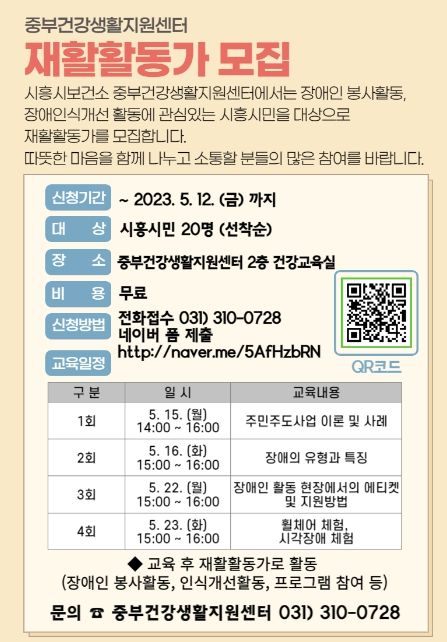 [제주교통복지신문 김강석 기자] 시흥시 중부건강생활지원센터는 장애인에 관심 있고, 장애인 인식 개선 활동을 함께할 재활활동가를 양성한다.