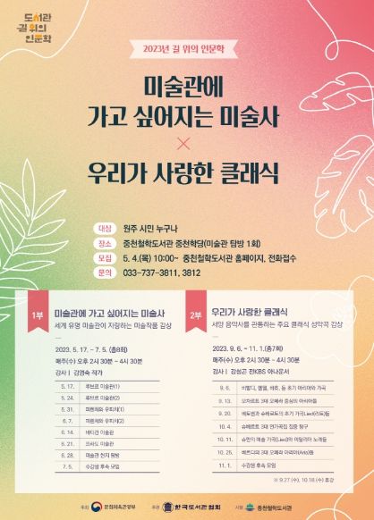 [제주교통복지신문 김강석 기자] 중천철학도서관은 ‘미술관에 가고 싶어지는 미술사’를 주제로 인문학 강좌를 운영한다.