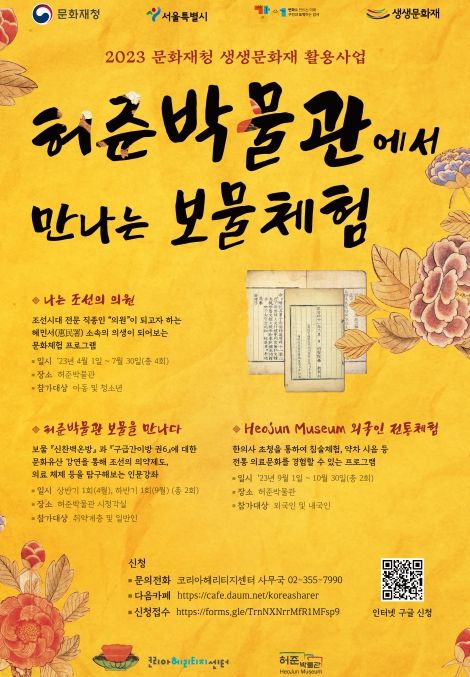 ‘허준박물관에서 만나는 보물체험’은 구암 허준 선생의 이야기를 담은 전통 의학 체험 프로그램으로, 내외국인들에 의학 전문 지식을 알리고 전통문화 향유 기회를 확대하고자 마련한 문화재청 공모 사업이다.