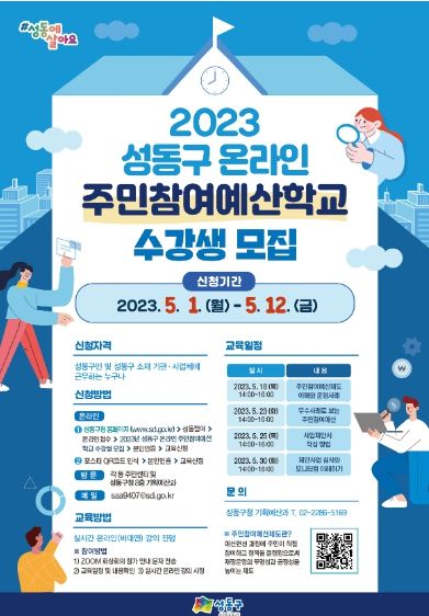 [제주교통복지신문 김강석 기자] 서울 성동구가 오는 12일까지 2023년 성동구 온라인 주민참여예산학교 수강생을 모집한다.