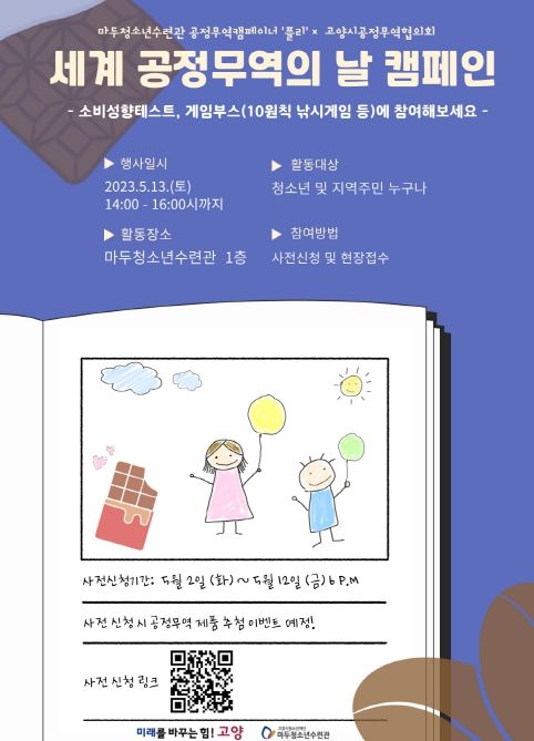 [제주교통복지신문 김강석 기자] 고양시청소년재단 마두청소년수련관 소속 공정무역 청소년 캠페이너 ‘플리’와 고양시공정무역협의회는 2023년 세계 공정무역의 날을 맞이하여 오는 5월 13일(토) 오후 2시부터 마두청소년수련관 1층에서 캠페인을 개최한다고 4일 밝혔다.