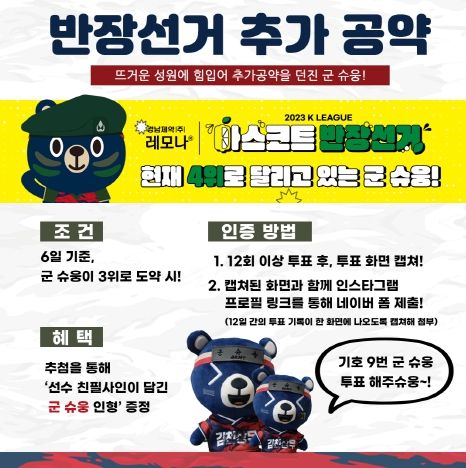 김천상무프로축구단이 3일 공식 인스타그램을 통해 ‘2023 K리그 마스코트 반장선거’에 참여하는 마스코트 ‘군 슈웅’의 추가 공약을 공개했다. 5월 6일 기준 군 슈웅이 3위 도약 시, 추가적으로 온라인 인증 이벤트를 실시한다. 김천상무는 반장선거 투표 인증 이벤트를 5월 13일 안양전 홈경기에서만 진행할 예정이었지만 상위권 순위 기록에 힘입어 온라인 추가 인증 이벤트를 실시하게 됐다.