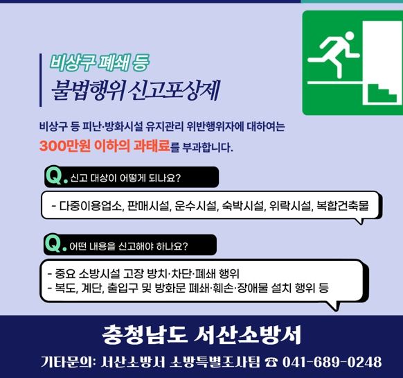 ‘비상구 폐쇄 등 불법행위 신고포상제’는 '충청남도 소방시설 등에 대한 불법행위 신고 포상 조례'에 따라 화재 발생 시 안전한 장소로 신속한 대피를 위한 비상구의 설치·유지 위반행위를 신고하면 포상하는 제도로, 증빙자료와 함께 관할 소방서 또는 국민신문고를 통해 접수하면 된다.