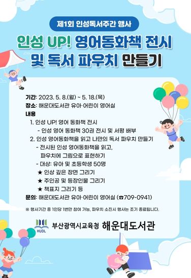 [제주교통복지신문 김강석 기자] 부산광역시립해운대도서관은 인성독서주간을 맞아 5월 8일부터 18일까지 유아와 어린이를 대상으로 ‘인성 UP! 영어동화책 전시 및 독서 파우치 만들기’행사를 운영한다.