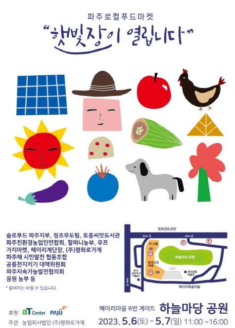 [제주교통복지신문 김강석 기자] 파주 로컬푸드마켓 ‘햇빛장’이 5월 6~7일 파주 탄현면 헤이리 예술마을 하늘마당공원에서 열린다.
