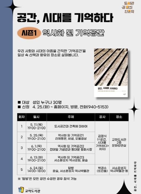 [제주교통복지신문 김강석 기자] 파주 교하도서관은 '2023년 도서관 길 위의 인문학 공모사업'에 선정됨에 따라 '공간, 시대를 기억하다'라는 주제로, 5월 11일 첫 강연을 시작한다.