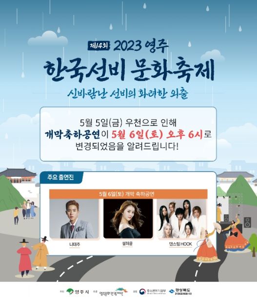 [제주교통복지신문 김강석 기자] 영주시는 오는 5일 저녁 7시 서천 둔치 특설무대에서 개최예정인 ‘2023영주 한국선비문화축제’ 개막식이 비 예보로 6일 저녁 6시로 연기됐다고 밝혔다.
