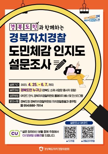 [제주교통복지신문 김강석 기자] 경북자치경찰위원회는 2021년 ‘경북자치경찰 말씀해주이소’설문조사 이후, 출범 3년차를 맞아 2023년도 경북형 자치경찰 정책아이디어 공모전과 도민체감인지도 설문조사를 실시한다.