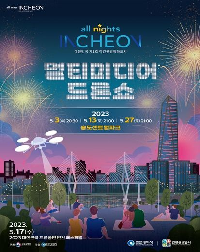 인천광역시와 인천관광공사는 5월 3일 저녁 송도 센트럴파크에서 ‘올 나이츠 인천(all nights INCHEON)’ 멀티미디어 드론쇼를 개최했다고 밝혔다. 드론쇼는 오는 13일과 27일에도 송도 센트럴파크에서 열린다.