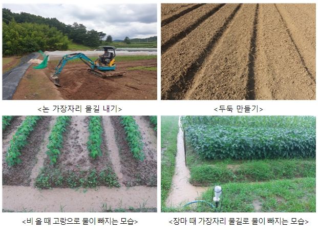 논 가장자리 물길 내기와 두둑 만들기는 입모율을 높이고 집중호우나 장마 피해를 줄이는 효과가 있다.