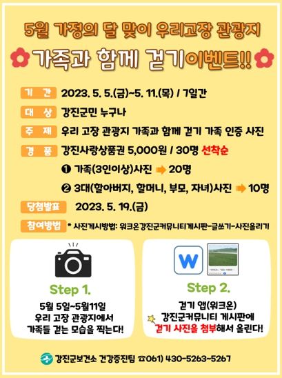이벤트는 강진군민 누구나 관내 관광지 걷는 모습(3인 이상 가족 등)을 찍어서 걷기앱(워크온) 강진군 커뮤니티 게시판에 올리면, 선착순 30명에게 모바일 강진사랑상품권 5천 원을 받는다.