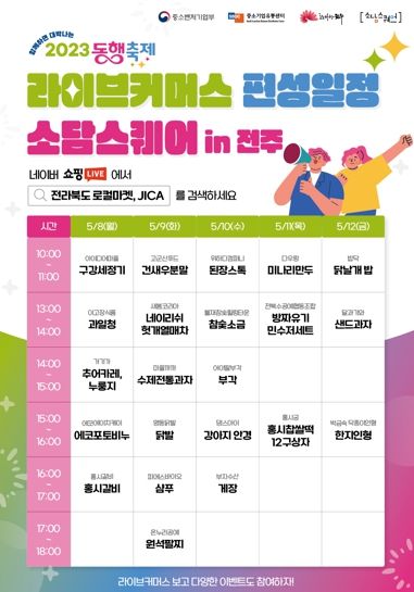 전주시와 전주정보문화산업진흥원은 오는 8일부터 12일까지 5일간 중소벤처기업부가 주최하는 ‘함께하면 대박나는 2023동행축제’를 기념하는 라이브커머스 기획전을 개최한다.