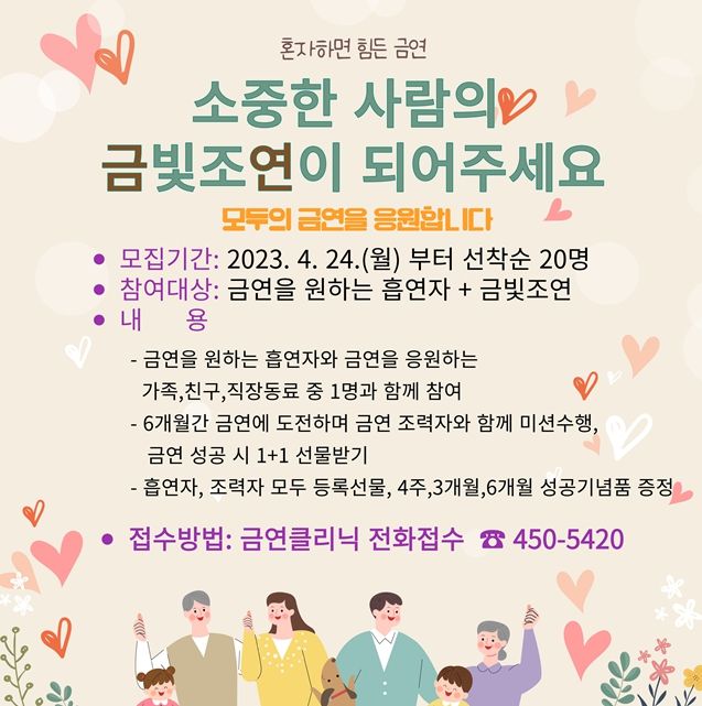 보건소 백승민 보건정책과장은 “금연은 흡연자 본인의 의지만으로 성공하기 힘들며, 직장동료, 친구, 가족 등 주변인의 응원과 지지가 매우 중요하다며, 이번 기회에 많은 흡연자가 참여하여 금빛조연 도움으로 금연에 성공하는 기회가 되길 바란다”고 전했다.