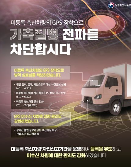축산차량의 소유자는 6월 30일까지 시 축산과에 자진 등록하고 차량무선인식장치(GPS단말기)를 장착하면 된다. 방역당국은 축산시설 출입 정보를 수집,관리해 가축전염병 방역 관리 업무에 활용하게 된다.