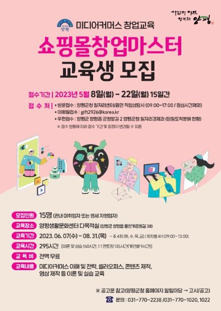 [제주교통복지신문 김강석 기자] 양평군은 2023년 경기도 공모사업인 지역·산업 맞춤형 일자리창출 지원사업 미디어커머스 창업교육 ‘쇼핑몰창업마스터’ 교육생을 5월 8일부터 22일까지 모집한다.