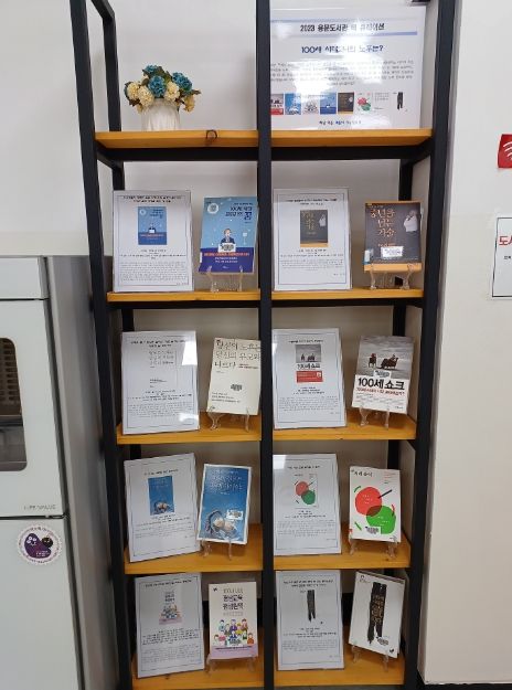 용문도서관에서 선별한 책은 ▲김영숙의 ‘바보야, 결론은 후반전이야’ ▲김영기 외 20명의 ‘100세 시대 평생교육 평생현역’ ▲임재홍의 ‘100세 시대 은퇴자의 꿈’ ▲김현기의 ‘100세 시대를 독(讀)하다’ ▲조계형의 ‘중년을 넘는 기술 15가지 방법’ ▲시라사와 다쿠지의 ‘치매 음식’ ▲강창희의 ‘당신의 노후는 당신의 부모와 다르다’ ▲NH투자증권 100세시대연구소의 ‘100세 쇼크’ 등 총 8권이다.