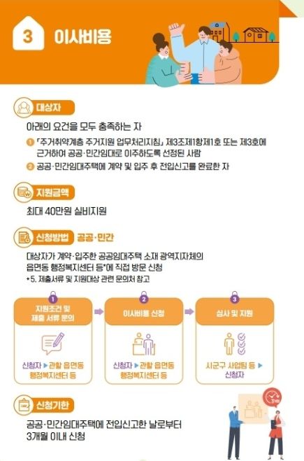 지원 대상은 쪽방, 반지하, 컨테이너, 비닐하우스 등에서 3개월 이상 거주한 가구 중 국토교통부 훈령인 '주거 취약계층 주거지원 업무처리지침'에 따라 ▲공공 임대주택으로 이주하도록 선정된 자 또는 ▲주택도시보증공사(HUG) 무이자 대출상품을 통해 민간임대주택으로 이주하는 자가 해당된다.