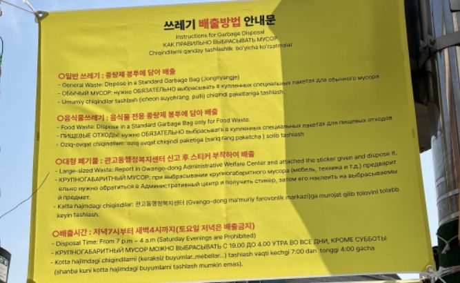 관고동에서는 외국인이 많이 거주하는 일부 지역에서 생활쓰레기 무단배출로 인한 민원이 지속적으로 제기됨에 따라, 4월부터 쓰레기 분리배출 번역 현수막을 게시하여, 영어·러시아어· 우즈베키스탄어로 쓰레기 종류별 배출방법 및 배출시간에 대하여 안내하고 있다.