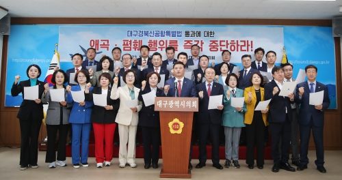 [제주교통복지신문 김강석 기자] 대구시의회 전경원 운영위원장(수성구4)은 5월 4일 제300회 임시회 제2차 본회의 후 대구・경북 통합신공항 특별법 통과와 관련한 특별법에 대한 더 이상의 폄훼와 편파 왜곡주장을 중단하고 대구・경북 통합신공항의 성공을 위해 다같이 화합하고 협력할 것을 촉구하는 성명서를 대구광역시의회 의원 전원의 이름으로 발표했다.