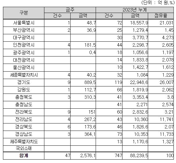 이번 주 집행예정인 47건 중 39건은 지역제한 입찰 또는 지역의무 공동도급 대상공사로, 1,152억 원 상당(45%)을 지역업체가 수주할 수 있을 것으로 예상된다.