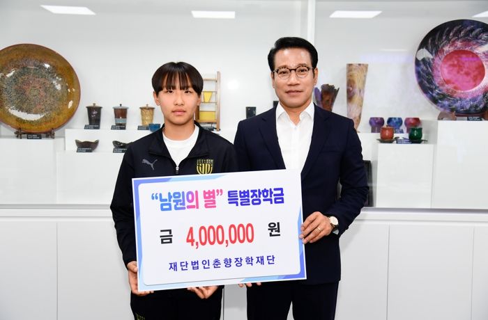 [제주교통복지신문 김강석 기자] (재)춘향장학재단은 지난 5월 4일에 15세이하 청소년축구 국가대표선수로 발탁된 박서인 선수에게 ‘남원의 별’ 특별장학금(400만원)을 지급했다.