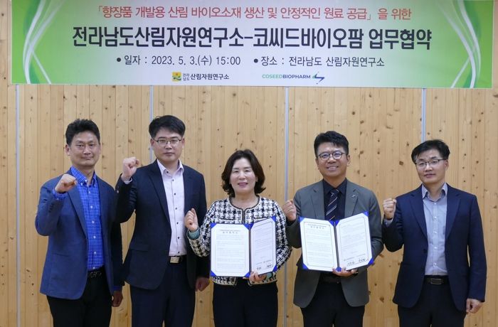 [제주교통복지신문 김강석 기자] 전라남도산림자원연구소는 ㈜코씨드바이오팜과 화장품 개발용 산림 바이오소재 생산 및 안정적 원료 공급을 위한 업무협약을 지난 3일 체결했다.
