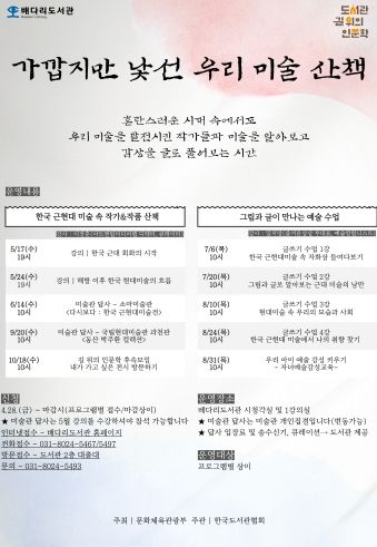 [제주교통복지신문 김강석 기자] 평택시 배다리도서관은 문화체육관광부가 주최하고 한국도서관협회가 주관한 2023년 도서관 길 위의 인문학 공모 사업에 선정되어, ‘가깝지만 낯선 우리 미술 산책’이라는 주제로 10회에 걸쳐 인문학 프로그램을 진행한다.