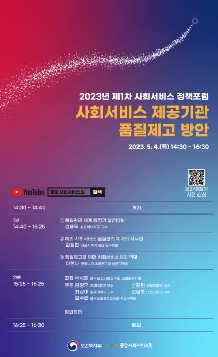 [제주교통복지신문 김강석 기자] 보건복지부, 중앙사회서비스원(원장 조상미)은 사회서비스 제공기관 품질제고 방안’을 주제로 5월 4일 목요일 14시 30분에 중앙사회서비스원에서 ‘제1차 사회서비스 정책 포럼’을 개최하고, 온라인으로도 참여할 수 있도록 생중계했다.