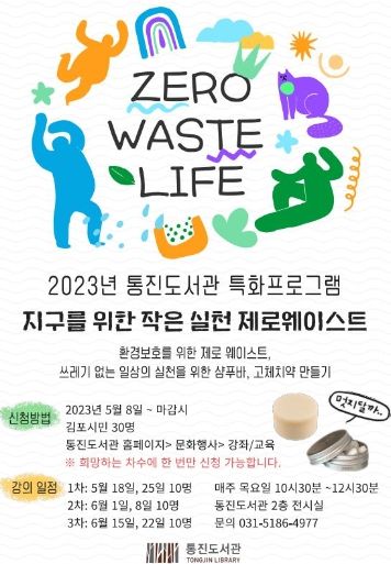교육은 매주 목요일 10시 30분 통진도서관 2층 전시실에서 진행된다. 제로웨이스트 문화에 관심 있는 김포시민 누구나 참여할 수 있다.