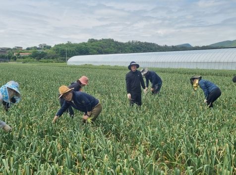이 날 일손 돕기는 농촌 고령화 등으로 일손이 부족한 농가를 돕고자, 홍보전산실 직원들이 참여해 계포리 마늘밭(5,280㎡)에서 마늘종 제거 작업에 팔을 걷어 붙였다.