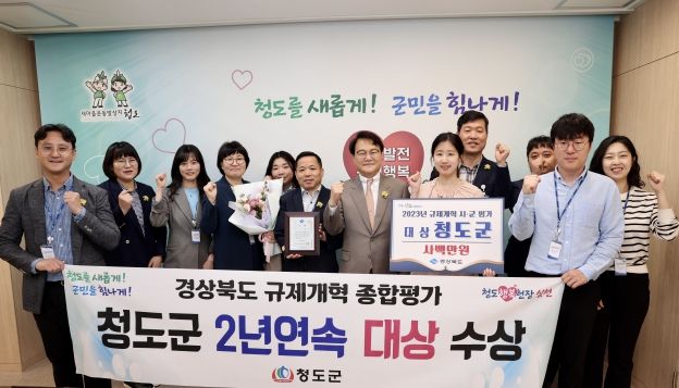 [제주교통복지신문 김강석 기자] 청도군은 경상북도가 주관한 ‘2023년도 규제개혁 종합평가’에서 2022년에 이어 2년 연속 군부 “대상”을 수상하면서, 규제개혁 우수 선도 지자체로 자리매김했다.