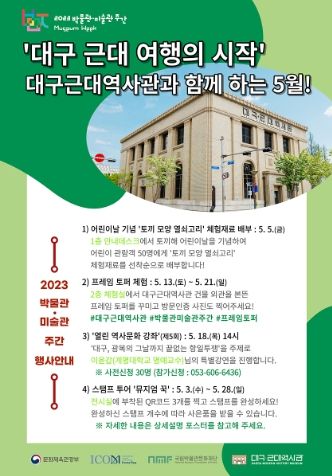 ‘세계 박물관의 날’(5월 18일)을 중심으로 앞뒤 날에 운영되는 ‘박물관·미술관 주간’(5.3.~5.28.)을 맞아, 대구근대역사관은 박물관의 사회적 역할 모색과 지역 박물관 활성화를 도모하고자 ‘‘대구 근대 여행의 시작’ 대구근대역사관과 함께하는 5월!’이란 주제로 ‘2023 박물관·미술관 주간’ 행사를 자체 기획했다.