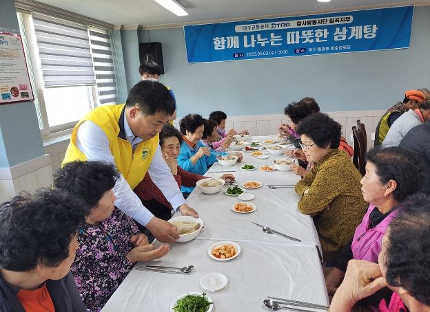 [제주교통복지신문 김강석 기자] 대구교통공사 참사랑봉사단 칠곡지부는 국우동 행정복지센터와 함께 지난 3일 동호동 주변 관내 어르신 70여 세대를 대상으로 ‘함께 나누는 따뜻한 삼계탕’행사를 가졌다.
