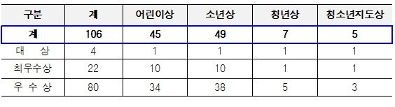 시상 부문은 ▴효행예절 ▴봉사협동 ▴희망성실 ▴창의과학예술 ▴글로벌리더십 총 5개 부문이다.
