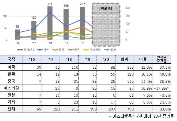 출원인 국적을 살펴보면, 미국이 42.3%(338건)로 가장 높은 비율을 차지했고, 한국은 16.1%(129건)로 2위를 차지했다. 뒤를 이어 중국 14.4%(115건), 이스라엘 10.9%(87건), 일본 7.6%(61건) 순이었다. 출원인 국적별 연평균 증가율은 한국 40.8%, 중국 38.8%, 미국 30.9% 순으로, 한국의 출원 증가율이 가장 가파른 것으로 나타났다.