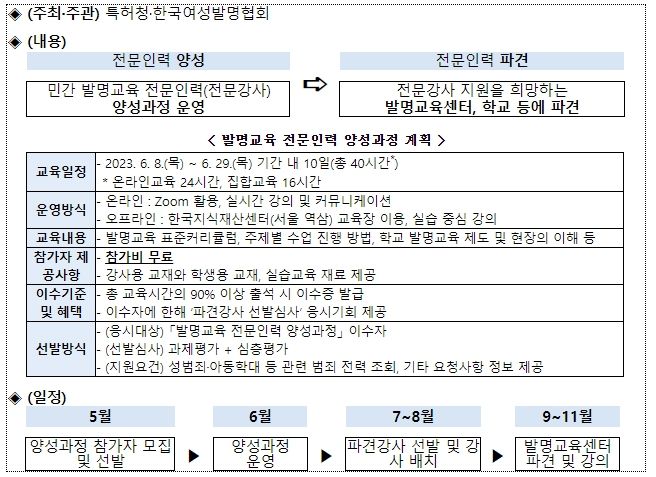 또한 발명교육 분야 민간 전문강사를 양성하여 학교현장에 파견하는'민간 발명교육 전문인력 양성 사업'도 새롭게 시작한다.