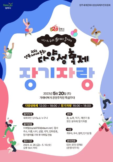 [제주교통복지신문 김강석 기자] 양주시는 오는 10일까지 ‘2023 양주 세계 문화 다양성 축제’장기자랑 대회 참가를 모집한다.